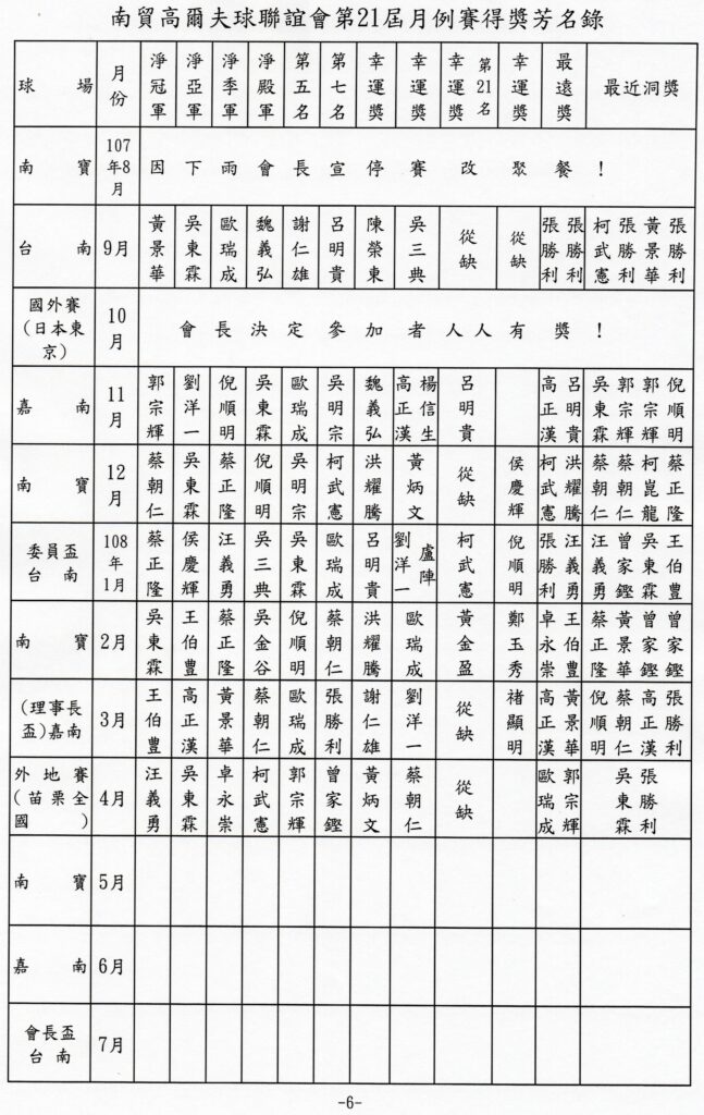 南貿高爾夫球聯誼會第二十一屆月例賽得獎芳名錄