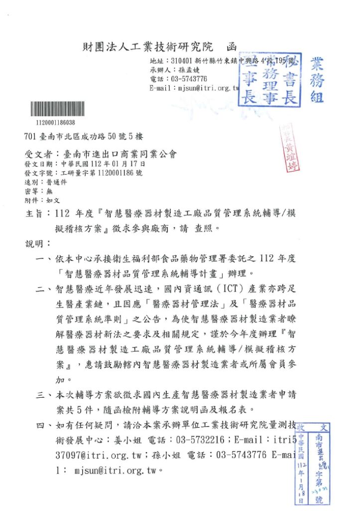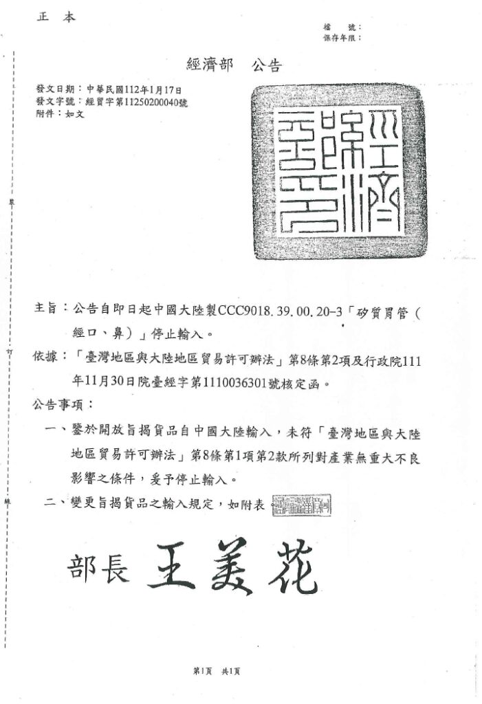 06 2 月 69105704 政府機關部門公告資訊 衛福部公告「人工水晶體」、「軟式及硬式透氣隱形眼鏡保存用產品」及「皮膚表面黏合用之組織黏合劑與傷口閉合裝置」等3項醫療器材臨床前測試基準 【發布日期:2023-02-04】 發布單位:醫療器材及化粧品組 31 1 月 69105704 政府機關部門公告資訊 財政部國庫署檢送經濟部「112年經濟部對受嚴重特殊傳染性肺炎疫情影響事業基本工資補貼」之委託與受理公告及作業要點各一份,請查照並轉知所轄菸酒業者及會員。 30 1 月 69105704 政府機關部門公告資訊 財團法人工業技術研究院112年度「智慧醫療器材製造工廠品質管理系統輔導/模擬稽核方案」徵求參與廠商,詳如附件。 30 1 月 69105704 政府機關部門公告資訊 行政院環境保護署「列管關注化學物質及其運作管理事項」業經公告修正,檢送公告影本及其附件供參。 30 1 月 69105704 政府機關部門公告資訊 經濟部國貿局112年1月17日貿服字第1120150098、1120150098A、1120150098B公告。 30 1 月 69105704 政府機關部門公告資訊 經濟部112年1月17日經貿字第11250200040號公告 « 上一頁 1 ... 191 192 193 194 195 下一頁 »
