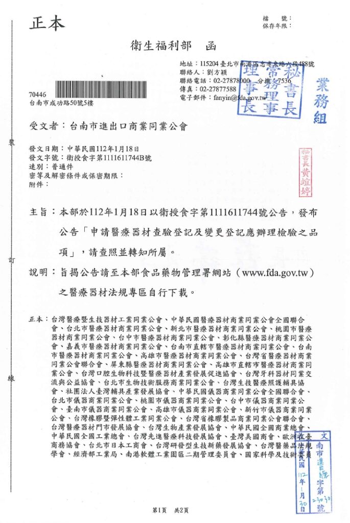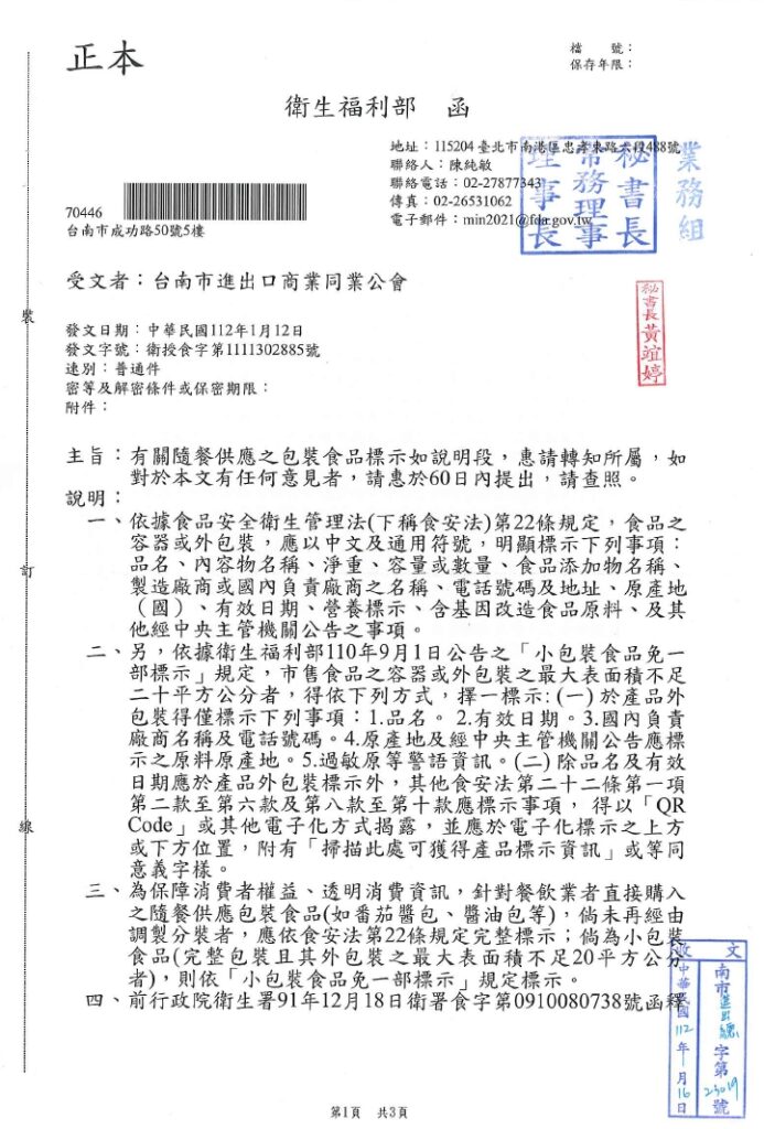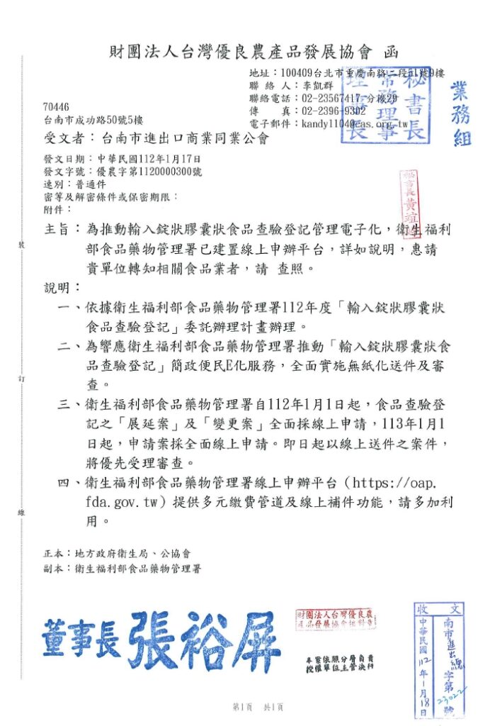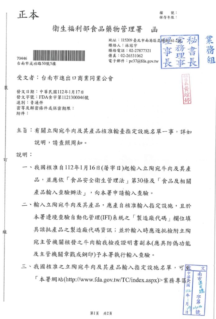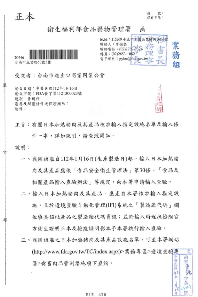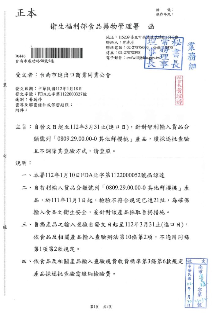 30 1 月 69105704 政府機關部門公告資訊 衛福部食品藥物管理署函自發文日起至112年3月31日止(進口日),針對智利輸入貨品分類號列「0809.29.00.00-0其他鮮櫻桃」,續採逐批查驗且不調降其查驗方式,請查照。 30 1 月 69105704 政府機關部門公告資訊 衛福部於112年1月18日以衛授食字第1111611744號公告,發布公告「申請醫療器材查驗登記及變更登記應辦理檢驗之品項」,請查照週知。 30 1 月 69105704 政府機關部門公告資訊 衛生福利部食品藥物管理署函有關日本加熱豬肉及其產品核准輸入指定設施名單及輸入條件一事,詳如說明,請查照周知。 30 1 月 69105704 政府機關部門公告資訊 衛福部食品藥物管理署有關立陶宛牛肉及其產品核准輸臺指定設施名單一事,詳如附件說明 30 1 月 69105704 政府機關部門公告資訊 財團法人台灣優良農產品發展協會為推動輸入錠狀膠囊狀食品查驗登記管理電子化,衛福部食藥署已建置線上申辦平台,詳如附件說明,請轉知相關食品業者。 30 1 月 69105704 政府機關部門公告資訊 衛福部函有關隨餐供應之包裝食品標示如說明段,惠請轉知所屬,如對於本文有意見者,請惠於60日內提出,請查照。 « 上一頁 1 ... 192 193 194 195 下一頁 »