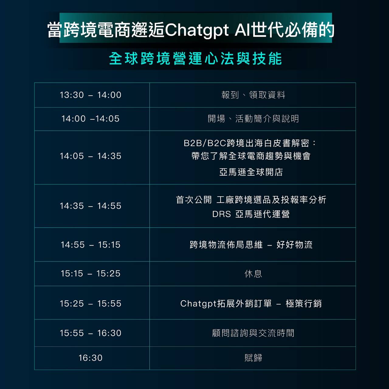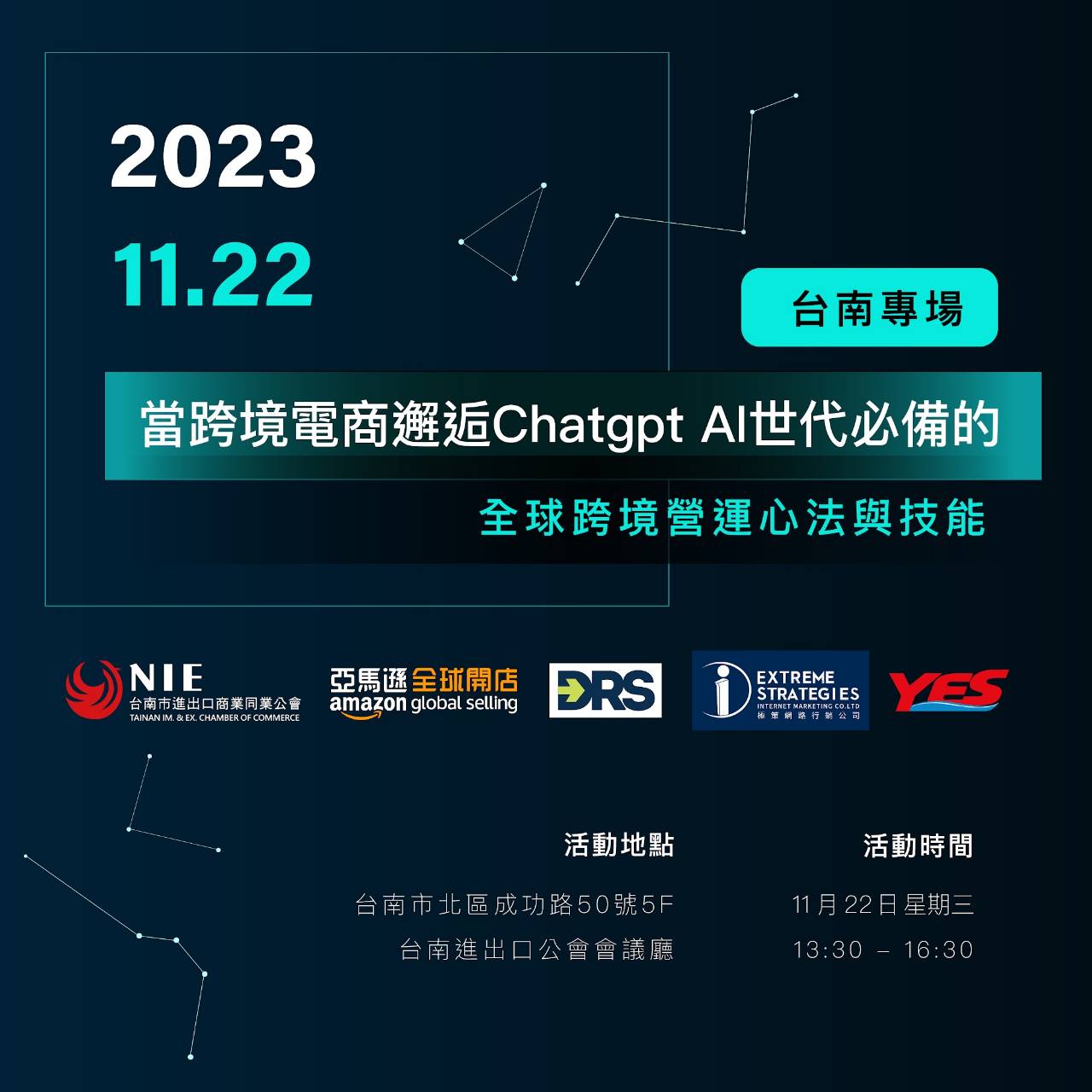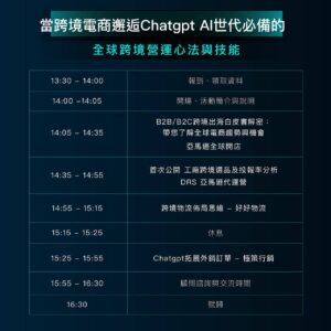 by 69105704 31 10 月, 2023 經貿活動暨說明會資訊 11/22 當跨境電商邂逅Chatgpt Al世代必備的全球跨境營運心法與技能-台南專場 活動地點:台南市進出口公會(台南市北區成功路50號5F) 活動時間:11月22日星期三13:30 – 16:30 線上報名