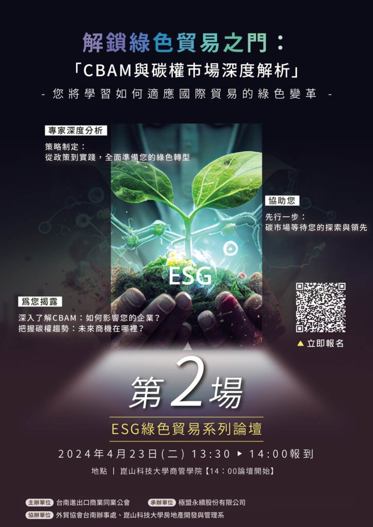 by 69105704 1 4 月, 2024 經貿活動暨說明會資訊 📅 CBAM與碳權市場深度解析研討會時間:4/23(二)1300-1700地點:崑山科大商管學院★補助單位:經濟部國際貿易署為您揭露:🔍 深入了解CBAM:如何影響您的企業?📈 把握碳權趨勢:未來商機在哪裡?專家深度分析:🌐 策略制定:從政策到實踐,全面準備您的綠色轉型協助您:🚀 先行一步:碳市場等待您的探索與領先👉 立即報名,開啟綠色商機的大門!https://forms.gle/VyGAg3aMsPyQjg8D7