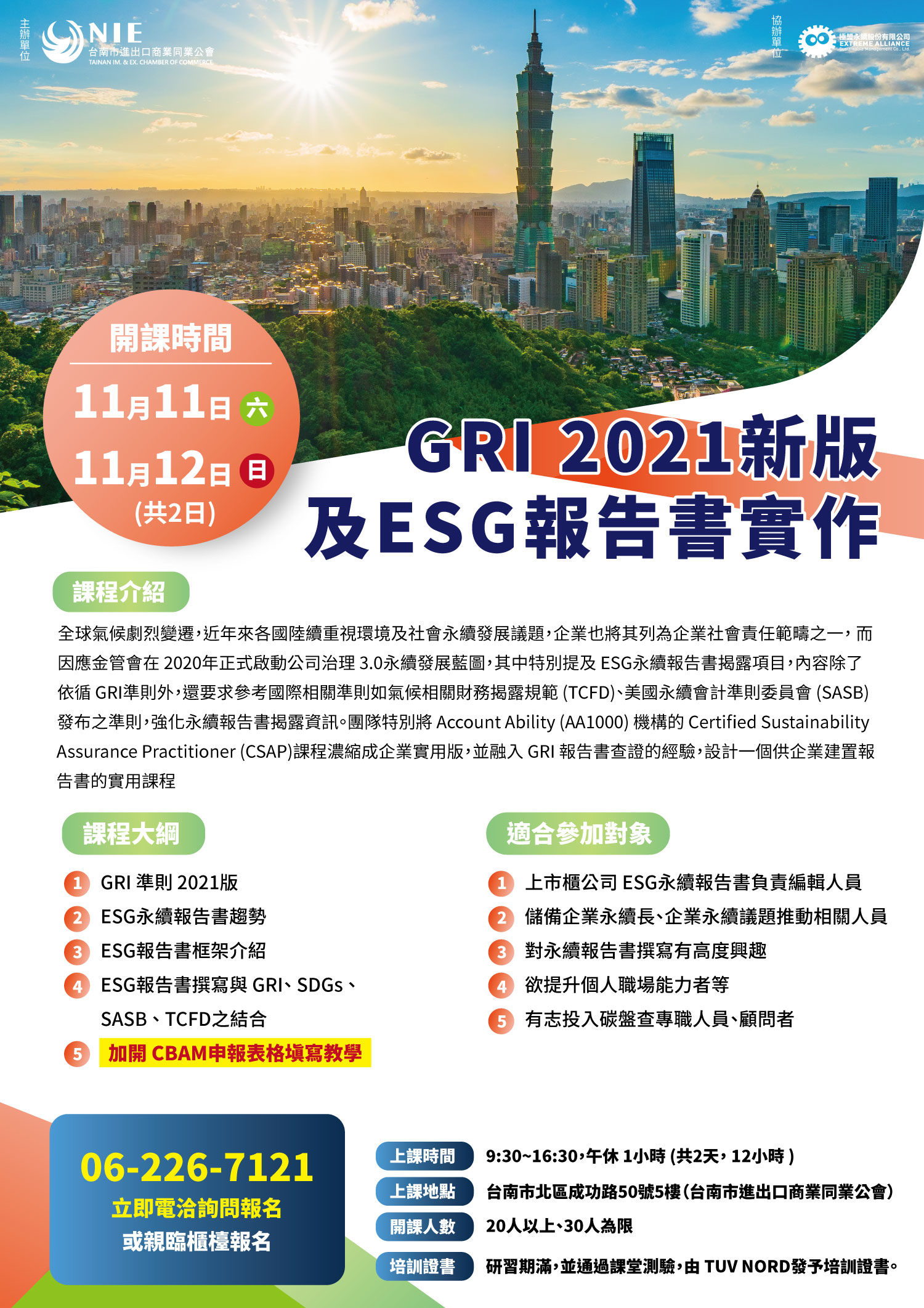 by 69105704 31 10 月, 2023 經貿活動暨說明會資訊 GRI-2021新版及ESG報告書實作課程 開課日期:112年11月11-12日 上課時間:09:30-16:30(午休一小時),共上課12小時。 地點:台南市北區成功路50號5F TEL:(06)2267121