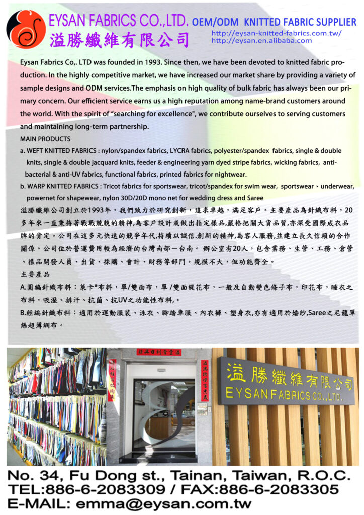 溢勝早期由供應休閒流行針織布料布商起家,隨後因應台灣的研究和技術優勢,漸將產品重心轉為機能性長纖布料。工廠各自埋頭苦幹的年代已經過去,溢勝積極與優良的紗廠、紗商、織廠、染廠、印花廠、後加工處理廠、助劑商甚至其他布商交流,因應國際趨勢合作開發產品,推廣台灣製造的機能性布料。